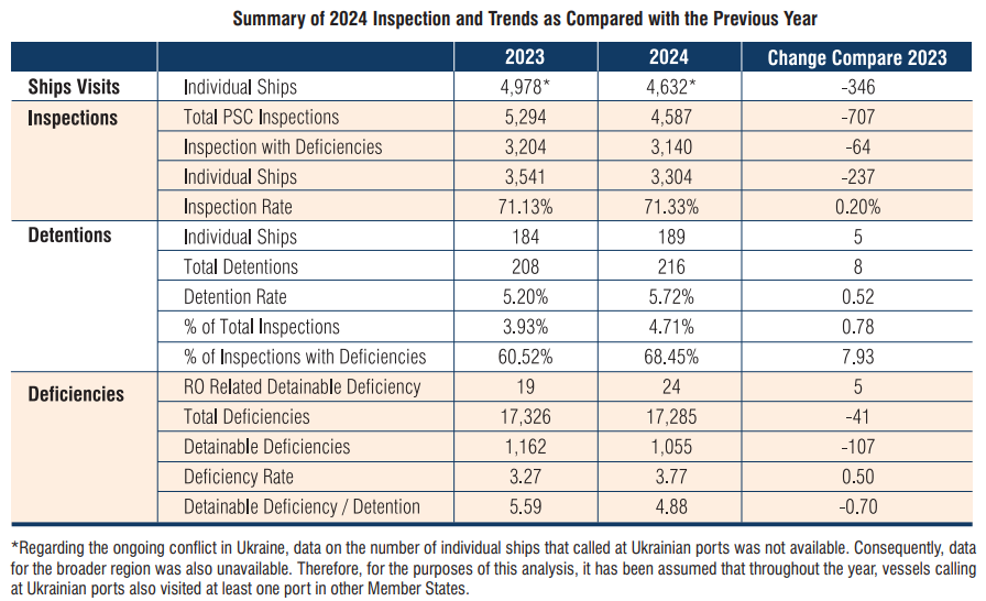 Due to the ongoing war in Ukraine, exact data on the number of individual ships operating in the region was unavailable. As a result, data for the broader region was not accessible. Therefore, for the purposes of this analysis, it has been assumed that vessels calling at Ukrainian ports also visited at least one port in other Member States. Based on this assumption, the regional inspection rate for 2024 was determined to be 71.33%.