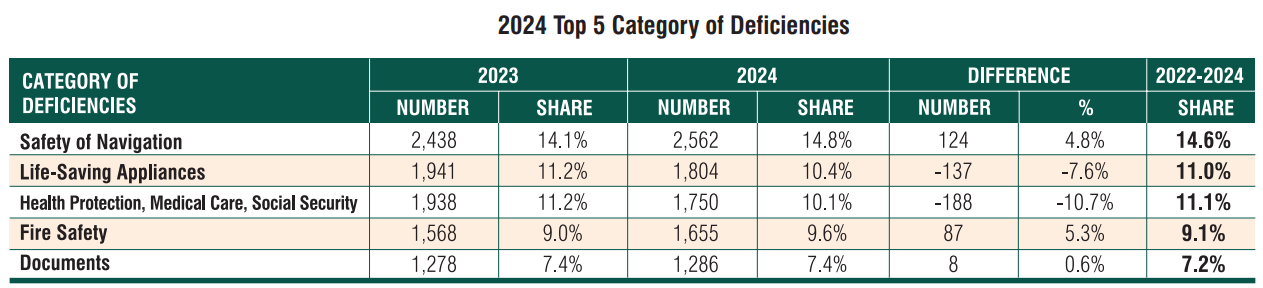 In 2024, a total of 17,285 deficiencies were recorded during the port State control inspections. The most frequently identified deficiencies were related to safety of navigation with 2,562 deficiencies (share of total deficiencies: 14.8%), life-saving appliances with 1,804 deficiencies (10.4%), health protection, medical care, social security with 1,750 deficiencies (10.1%), fire safety with 1,655 deficiencies (9.6%) and documents with 1,286 deficiencies (7.4%). These five categories collectively accounted for 52.3% of all deficiencies recorded in 2024.