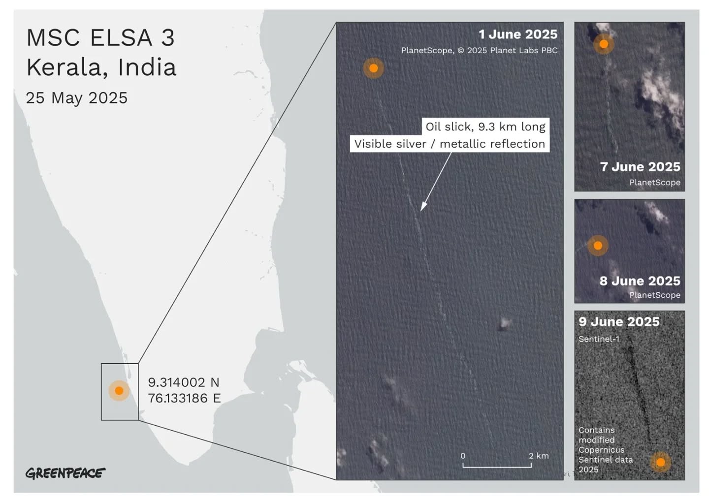 The Liberian-flagged ship was carrying hazardous materials, including calcium carbide, sulphur, diesel, and furnace oil, when it capsized in the Arabian Sea. While no major oil slick had reached the Kerala shoreline by early reports, containers have washed ashore and a visible oil slick was detected near the site. Cleanup operations by the Indian Coast Guard and Navy are ongoing, with a 20-nautical-mile fishing restriction in place. However, Greenpeace demands: